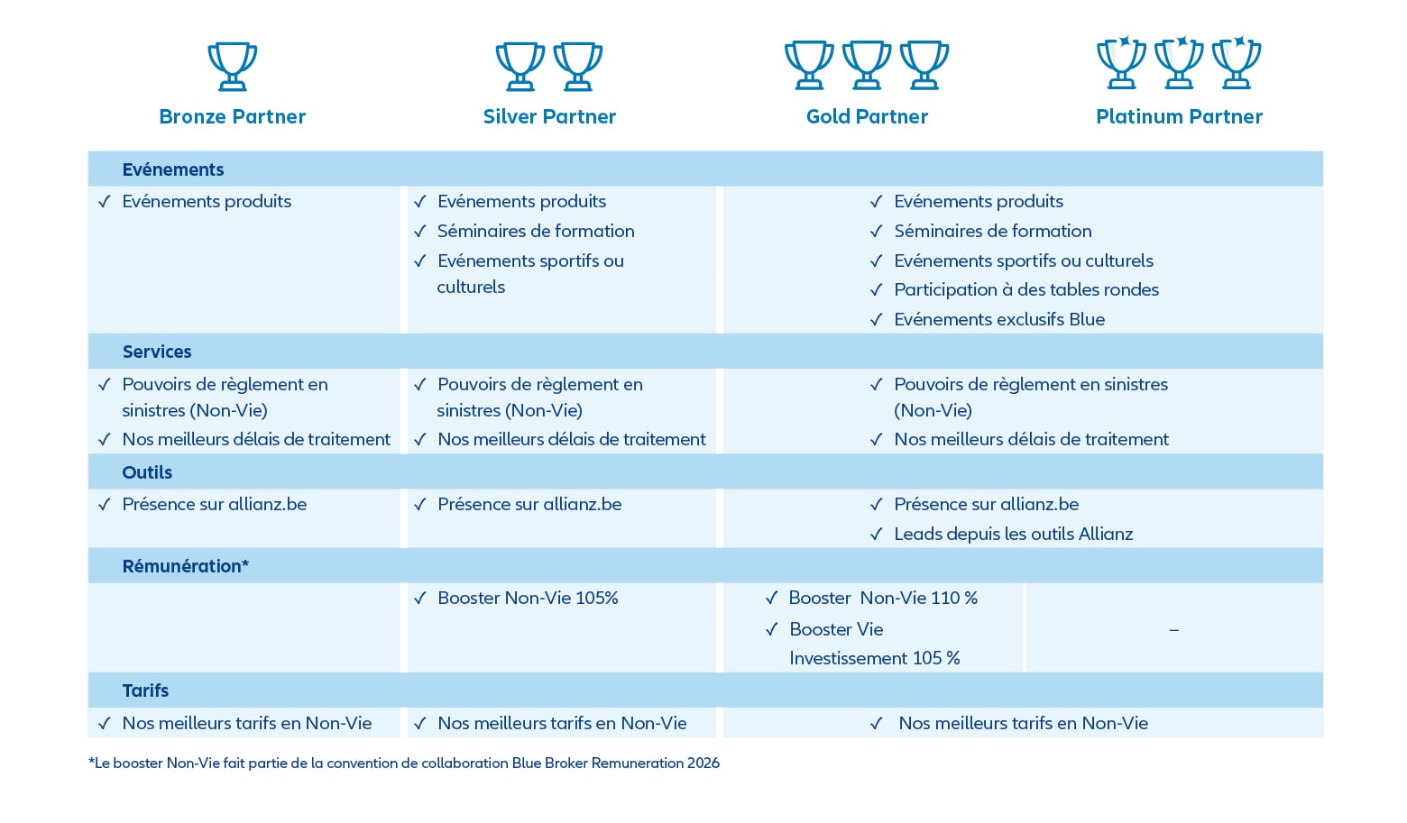 Inspiré par la longue tradition de sponsoring sportif d’Allianz, chaque profil Blue est représenté par un nombre croissant de trophées, vous donnant droit à des avantages et services personnalisés.