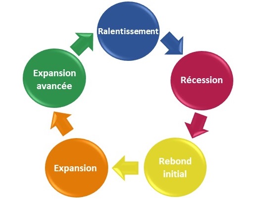 La phase qui suit directement la récession est un rebond initial. Il s’agit souvent d’une période de quelques mois durant lesquels le sentiment du marché s’inverse de négatif à positif grâce à une reprise de confiance dans le futur. Les mesures de stimulation sont souvent présentes durant cette période, pensez aux taux d’intérêt faibles ou aux programmes de rachat comme nous les connaissons via la Banque centrale européenne pour le moment. Durant une telle période, les taux et l’inflation sont souvent peu élevés mais peuvent commencer à monter. On a une forte confiance dans le potentiel de croissance et on ose prendre des risques.