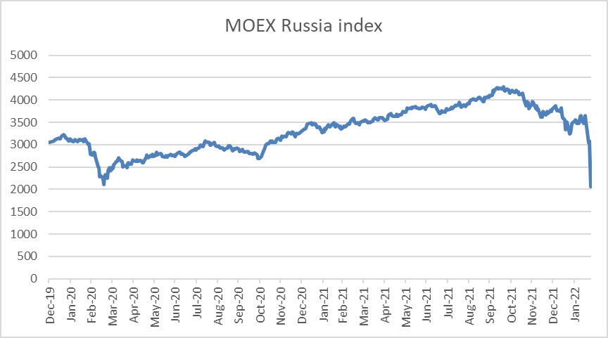 Les dirigeants occidentaux n’auront d’autre choix que de prendre des sanctions beaucoup plus importantes, cela amplifie un regain d’aversion pour le risque particulièrement fort ce matin. À 10h, l’indice Euro Stoxx était en recul de 3%, entrant même en territoire de correction. Les taux souverains européens reculaient de 7 points de base, le pétrole avait passé la barre des 103 dollars le baril pour le Brent au plus haut sur 8 ans, le gaz était en hausse de 29% (la Russie fournit près de 40% du gaz consommé sur le Vieux Continent) et le blé progressait de 3%.