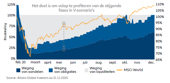 Uit de evolutie van de aandelenblootstelling in 2020 in vergelijking met de ontwikkeling van de mondiale aandelenindex, blijkt dat de toename van de weging in aandelen ver achterop loopt in vergelijking met het herstel van de aandelenmarkten (in het voorbeeld van het Strategy Balanced fonds). De weging van het fonds in aandelen aan het einde van december 2020 bedroeg evenwel 100%, tegen een gemiddelde doelstelling van 50%.